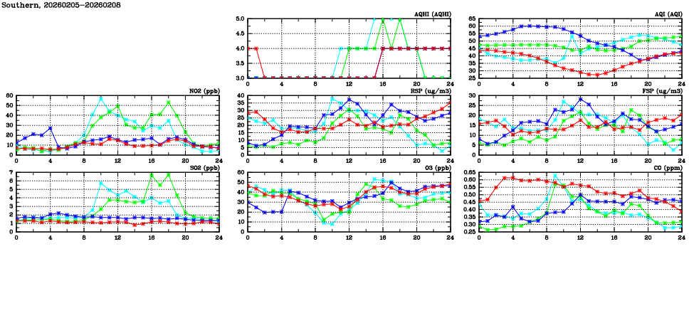 | Air Quality Data Time Series in Southern (2026/02/08) | ( Line colors: Day -3 Day -2 Day -1 Current day ) | 2D Map Current AQHI |