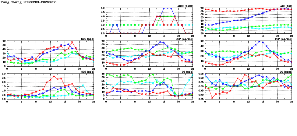| Air Quality Data Time Series in Tung Chung (2026/02/06) | ( Line colors: Day -3 Day -2 Day -1 Current day ) | 2D Map Current AQHI |