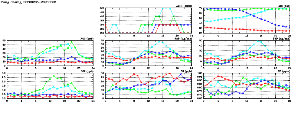 | Air Quality Data Time Series in Tung Chung (2026/02/08) | ( Line colors: Day -3 Day -2 Day -1 Current day ) | 2D Map Current AQHI |