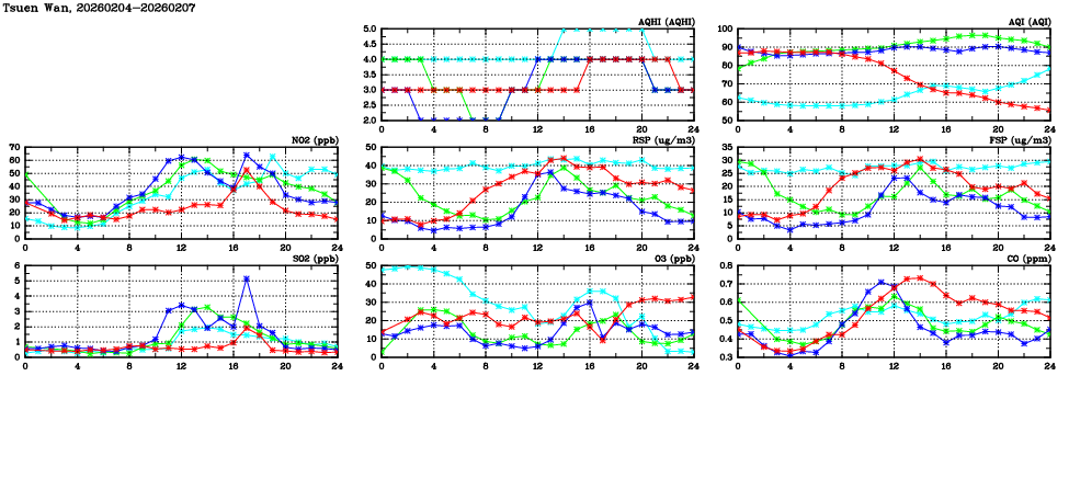 | Air Quality Data Time Series in Tsuen Wan (2026/02/07) | ( Line colors: Day -3 Day -2 Day -1 Current day ) | 2D Map Current AQHI |