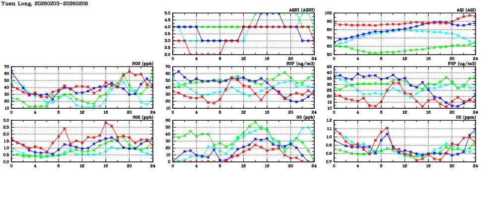 | Air Quality Data Time Series in Yuen Long (2026/02/06) | ( Line colors: Day -3 Day -2 Day -1 Current day ) | 2D Map Current AQHI |