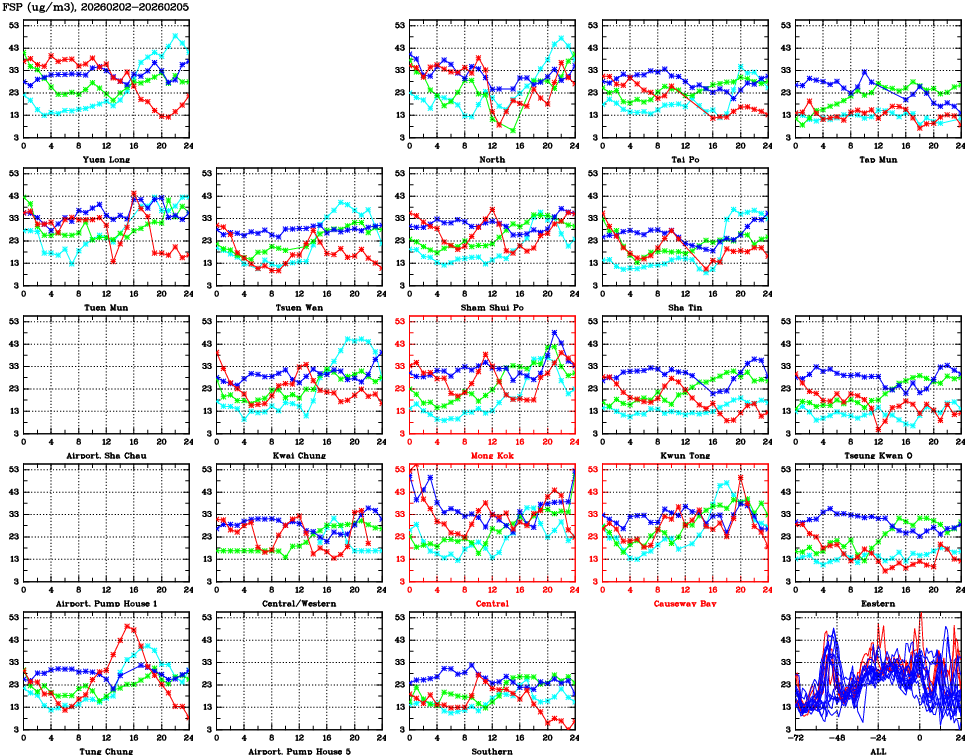 | Air Quality Data Time Series for FSP (2026/02/05) | ( Line colors: Day -3 Day -2 Day -1 Current day ) | 2D Map Current AQHI |