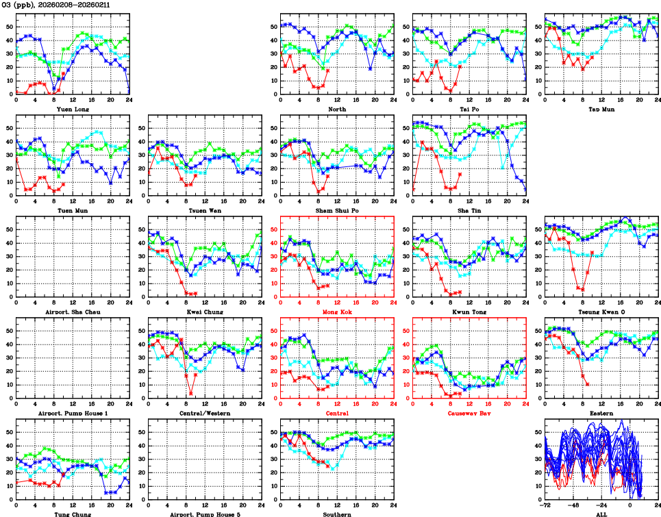 | Air Quality Data Time Series for O3 (2026/02/11) | ( Line colors: Day -3 Day -2 Day -1 Current day ) | 2D Map Current AQHI |