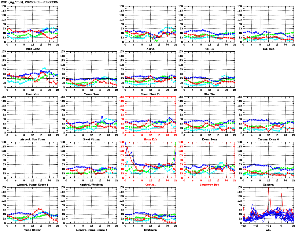 | Air Quality Data Time Series for RSP (2026/02/05) | ( Line colors: Day -3 Day -2 Day -1 Current day ) | 2D Map Current AQHI |
