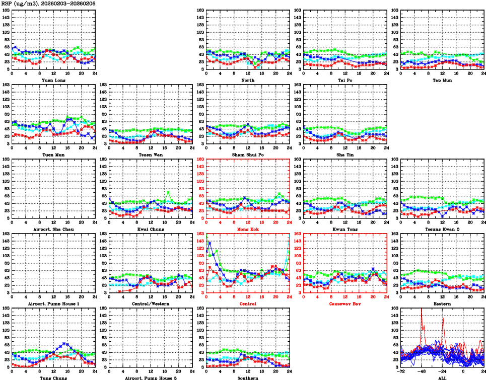 | Air Quality Data Time Series for RSP (2026/02/06) | ( Line colors: Day -3 Day -2 Day -1 Current day ) | 2D Map Current AQHI |