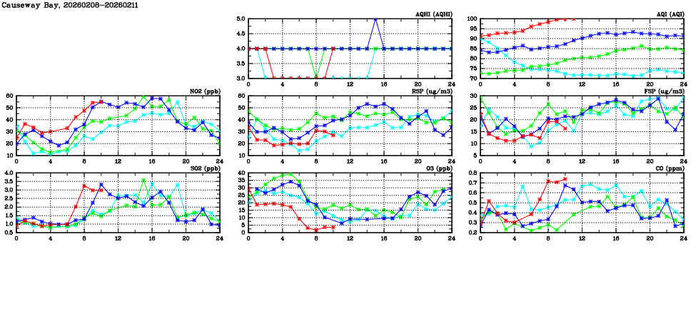 | Air Quality Data Time Series in Causeway Bay (2026/02/11) | ( Line colors: Day -3 Day -2 Day -1 Current day ) | 2D Map Current AQHI |