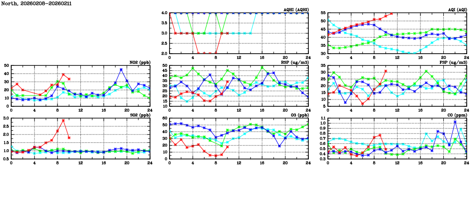 | Air Quality Data Time Series in North (2026/02/11) | ( Line colors: Day -3 Day -2 Day -1 Current day ) | 2D Map Current AQHI |