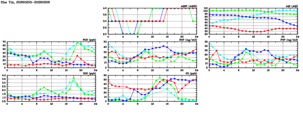 | Air Quality Data Time Series in Sha Tin (2026/02/08) | ( Line colors: Day -3 Day -2 Day -1 Current day ) | 2D Map Current AQHI |