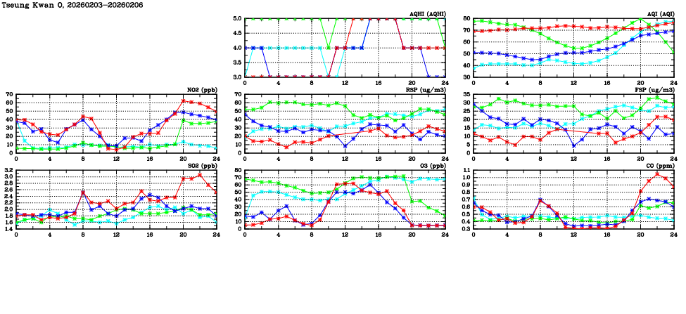 | Air Quality Data Time Series in Tseung Kwan O (2026/02/06) | ( Line colors: Day -3 Day -2 Day -1 Current day ) | 2D Map Current AQHI |