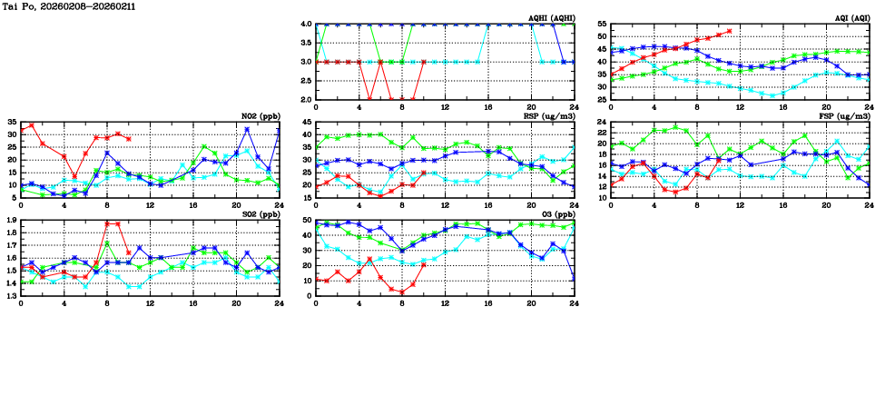 | Air Quality Data Time Series in Tai Po (2026/02/11) | ( Line colors: Day -3 Day -2 Day -1 Current day ) | 2D Map Current AQHI |