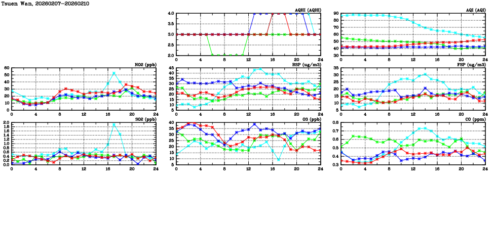 | Air Quality Data Time Series in Tsuen Wan (2026/02/10) | ( Line colors: Day -3 Day -2 Day -1 Current day ) | 2D Map Current AQHI |