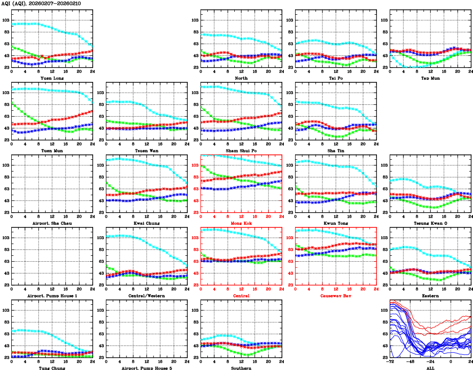 | Air Quality Data Time Series for AQI (2026/02/10) | ( Line colors: Day -3 Day -2 Day -1 Current day ) | 2D Map Current AQHI |