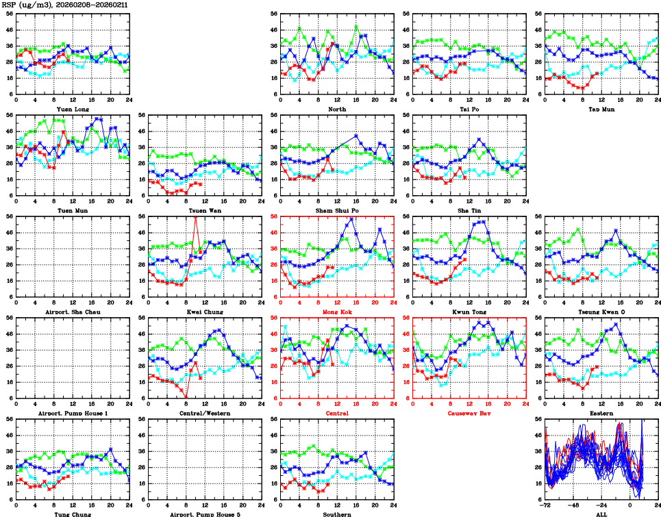 | Air Quality Data Time Series for RSP (2026/02/11) | ( Line colors: Day -3 Day -2 Day -1 Current day ) | 2D Map Current AQHI |