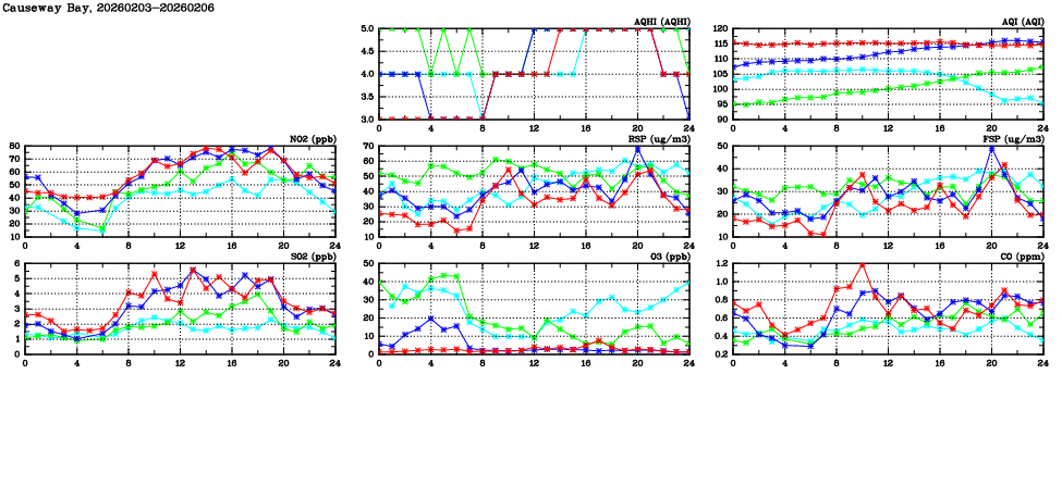 | Air Quality Data Time Series in Causeway Bay (2026/02/06) | ( Line colors: Day -3 Day -2 Day -1 Current day ) | 2D Map Current AQHI |