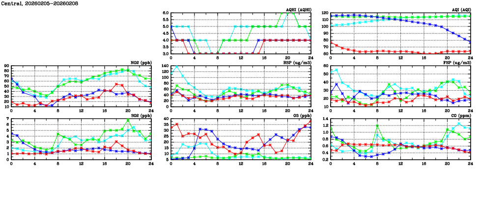 | Air Quality Data Time Series in Central (2026/02/08) | ( Line colors: Day -3 Day -2 Day -1 Current day ) | 2D Map Current AQHI |