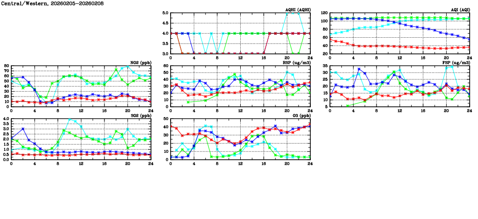 | Air Quality Data Time Series in Central/Western (2026/02/08) | ( Line colors: Day -3 Day -2 Day -1 Current day ) | 2D Map Current AQHI |
