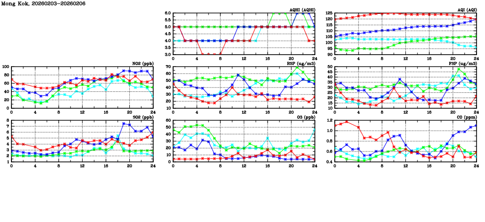 | Air Quality Data Time Series in Mong Kok (2026/02/06) | ( Line colors: Day -3 Day -2 Day -1 Current day ) | 2D Map Current AQHI |