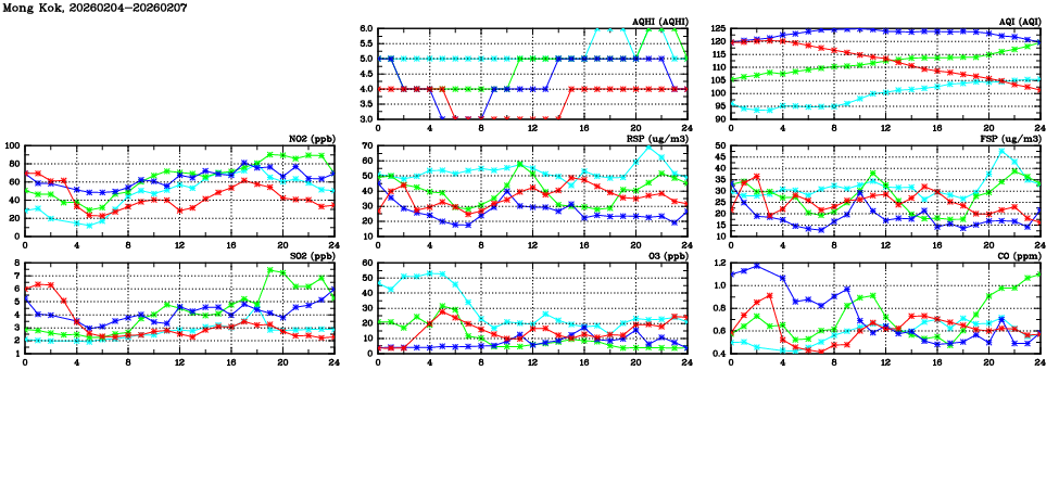 | Air Quality Data Time Series in Mong Kok (2026/02/07) | ( Line colors: Day -3 Day -2 Day -1 Current day ) | 2D Map Current AQHI |