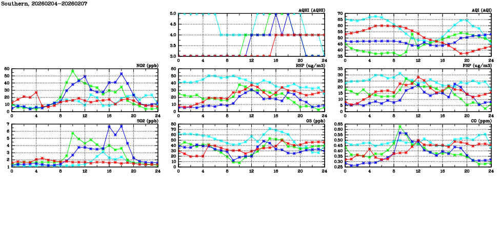 | Air Quality Data Time Series in Southern (2026/02/07) | ( Line colors: Day -3 Day -2 Day -1 Current day ) | 2D Map Current AQHI |