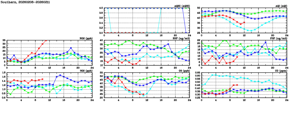 | Air Quality Data Time Series in Southern (2026/02/11) | ( Line colors: Day -3 Day -2 Day -1 Current day ) | 2D Map Current AQHI |