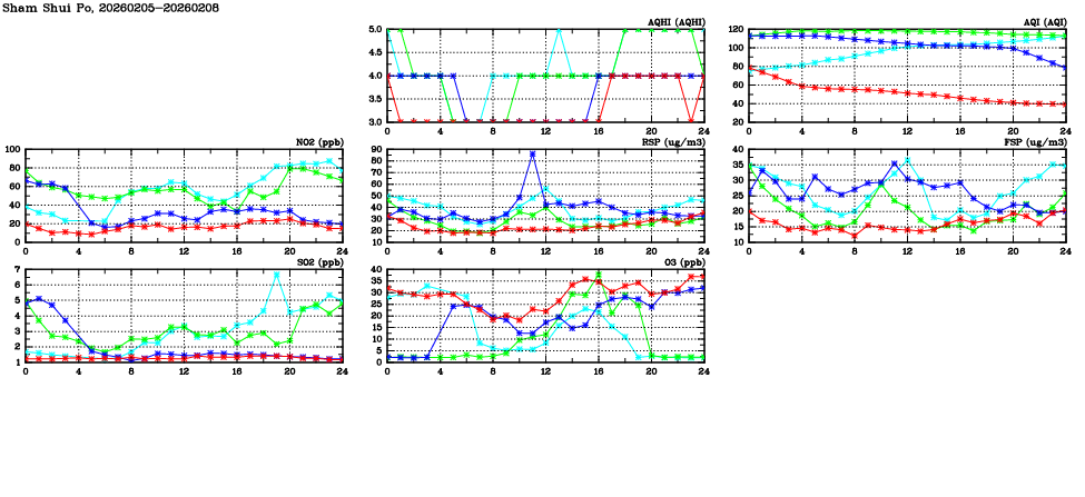 | Air Quality Data Time Series in Sham Shui Po (2026/02/08) | ( Line colors: Day -3 Day -2 Day -1 Current day ) | 2D Map Current AQHI |