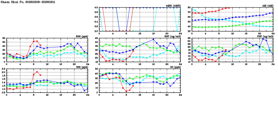 | Air Quality Data Time Series in Sham Shui Po (2026/02/11) | ( Line colors: Day -3 Day -2 Day -1 Current day ) | 2D Map Current AQHI |
