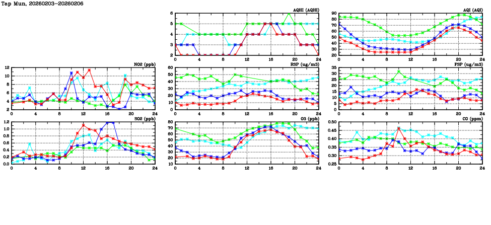 | Air Quality Data Time Series in Tap Mun (2026/02/06) | ( Line colors: Day -3 Day -2 Day -1 Current day ) | 2D Map Current AQHI |