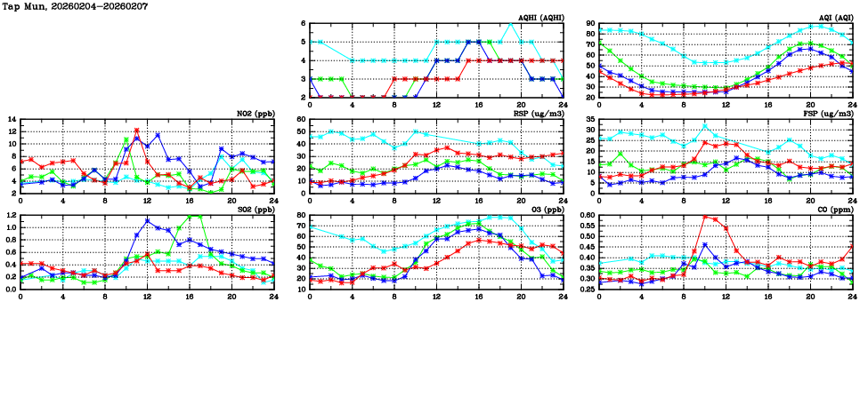 | Air Quality Data Time Series in Tap Mun (2026/02/07) | ( Line colors: Day -3 Day -2 Day -1 Current day ) | 2D Map Current AQHI |