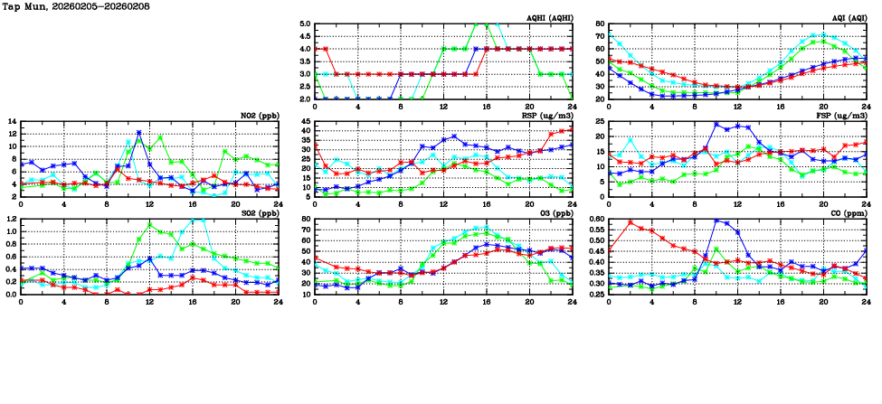 | Air Quality Data Time Series in Tap Mun (2026/02/08) | ( Line colors: Day -3 Day -2 Day -1 Current day ) | 2D Map Current AQHI |