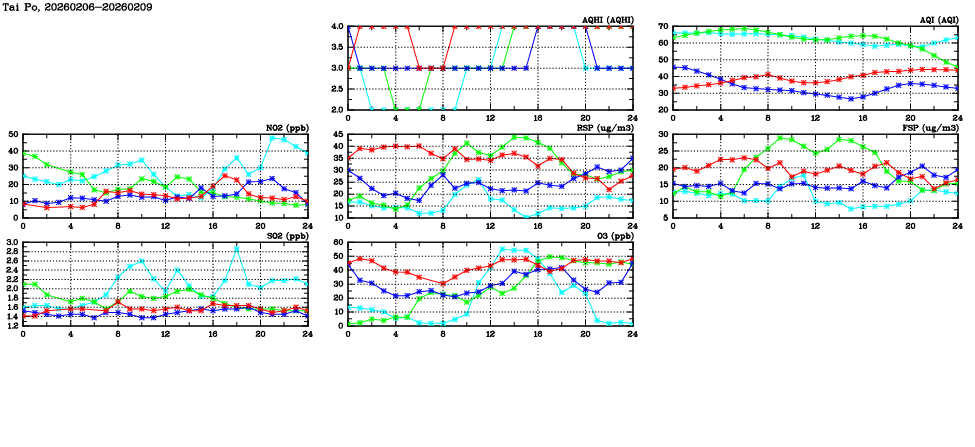 | Air Quality Data Time Series in Tai Po (2026/02/09) | ( Line colors: Day -3 Day -2 Day -1 Current day ) | 2D Map Current AQHI |