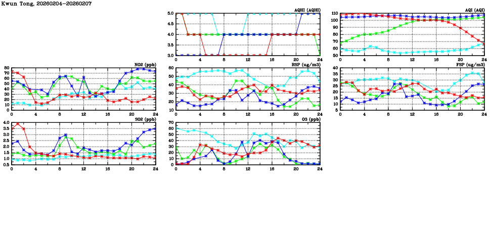 | Air Quality Data Time Series in Kwun Tong (2026/02/07) | ( Line colors: Day -3 Day -2 Day -1 Current day ) | 2D Map Current AQHI |