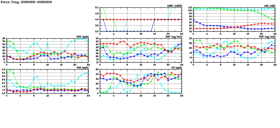 | Air Quality Data Time Series in Kwun Tong (2026/02/09) | ( Line colors: Day -3 Day -2 Day -1 Current day ) | 2D Map Current AQHI |