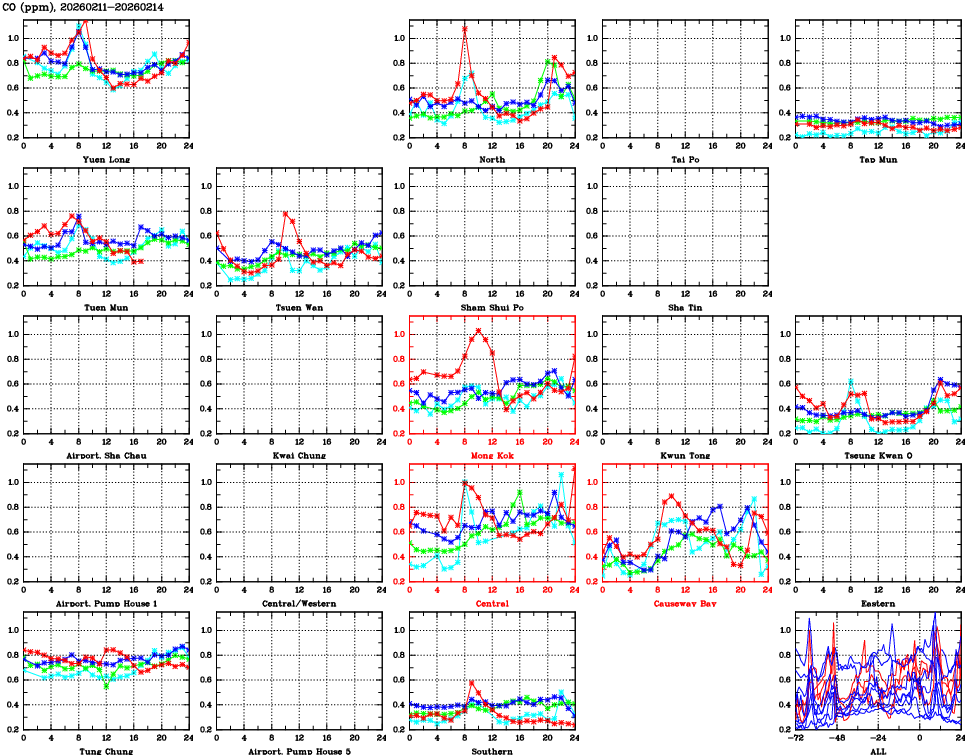 | Air Quality Data Time Series for CO (2026/02/14) | ( Line colors: Day -3 Day -2 Day -1 Current day ) | 2D Map Current AQHI |