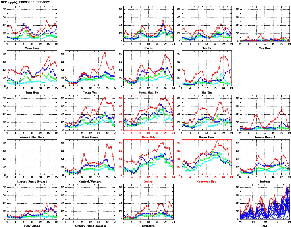 | Air Quality Data Time Series for NO2 (2026/02/11) | ( Line colors: Day -3 Day -2 Day -1 Current day ) | 2D Map Current AQHI |