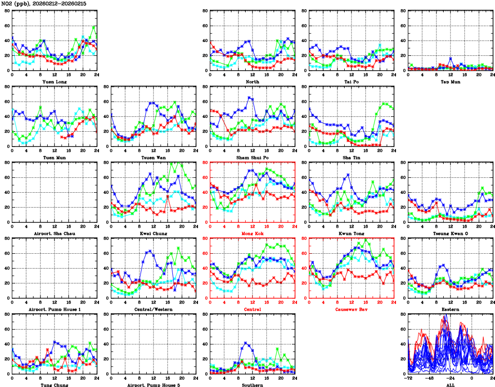 | Air Quality Data Time Series for NO2 (2026/02/15) | ( Line colors: Day -3 Day -2 Day -1 Current day ) | 2D Map Current AQHI |
