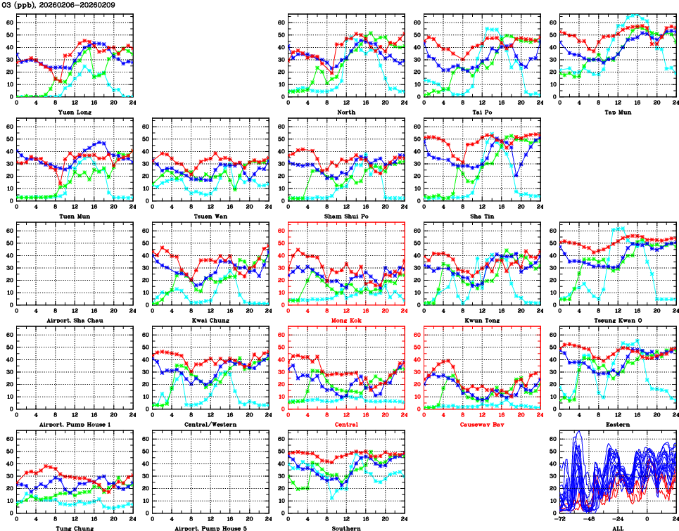 | Air Quality Data Time Series for O3 (2026/02/09) | ( Line colors: Day -3 Day -2 Day -1 Current day ) | 2D Map Current AQHI |