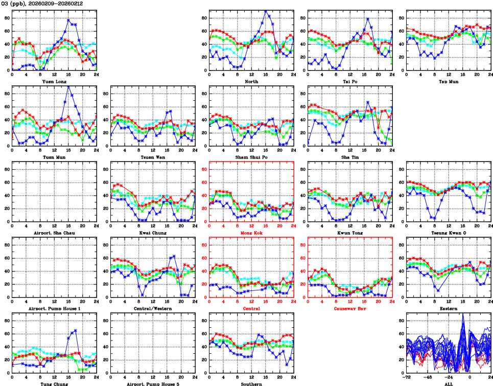 | Air Quality Data Time Series for O3 (2026/02/12) | ( Line colors: Day -3 Day -2 Day -1 Current day ) | 2D Map Current AQHI |