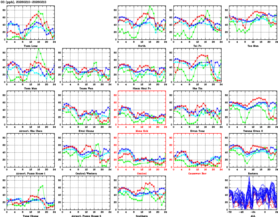 | Air Quality Data Time Series for O3 (2026/02/13) | ( Line colors: Day -3 Day -2 Day -1 Current day ) | 2D Map Current AQHI |