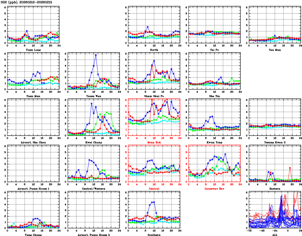 | Air Quality Data Time Series for SO2 (2026/02/15) | ( Line colors: Day -3 Day -2 Day -1 Current day ) | 2D Map Current AQHI |