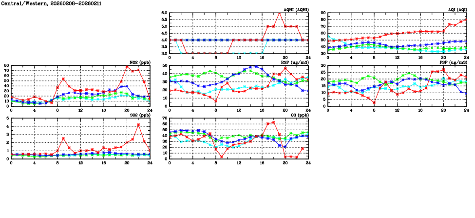 | Air Quality Data Time Series in Central/Western (2026/02/11) | ( Line colors: Day -3 Day -2 Day -1 Current day ) | 2D Map Current AQHI |