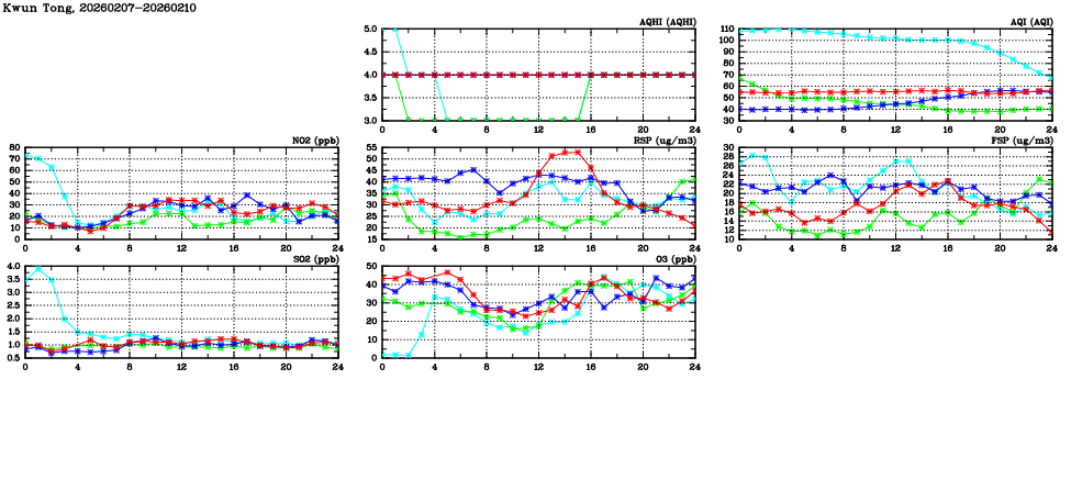 | Air Quality Data Time Series in Kwun Tong (2026/02/10) | ( Line colors: Day -3 Day -2 Day -1 Current day ) | 2D Map Current AQHI |