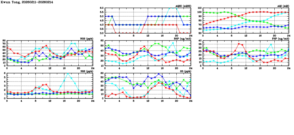 | Air Quality Data Time Series in Kwun Tong (2026/02/14) | ( Line colors: Day -3 Day -2 Day -1 Current day ) | 2D Map Current AQHI |