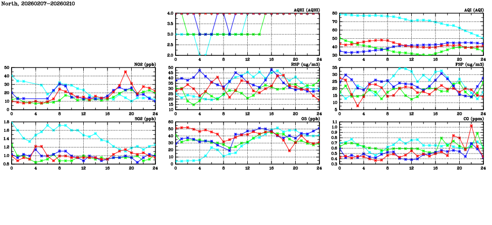 | Air Quality Data Time Series in North (2026/02/10) | ( Line colors: Day -3 Day -2 Day -1 Current day ) | 2D Map Current AQHI |