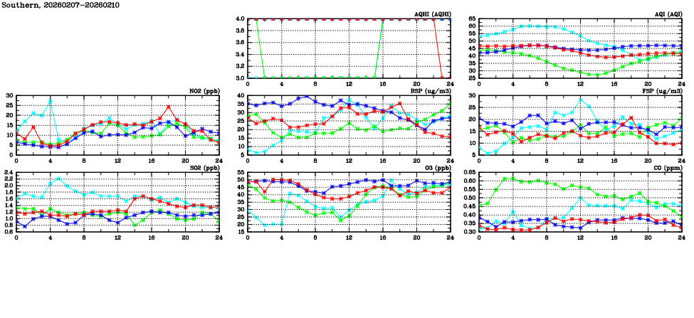 | Air Quality Data Time Series in Southern (2026/02/10) | ( Line colors: Day -3 Day -2 Day -1 Current day ) | 2D Map Current AQHI |