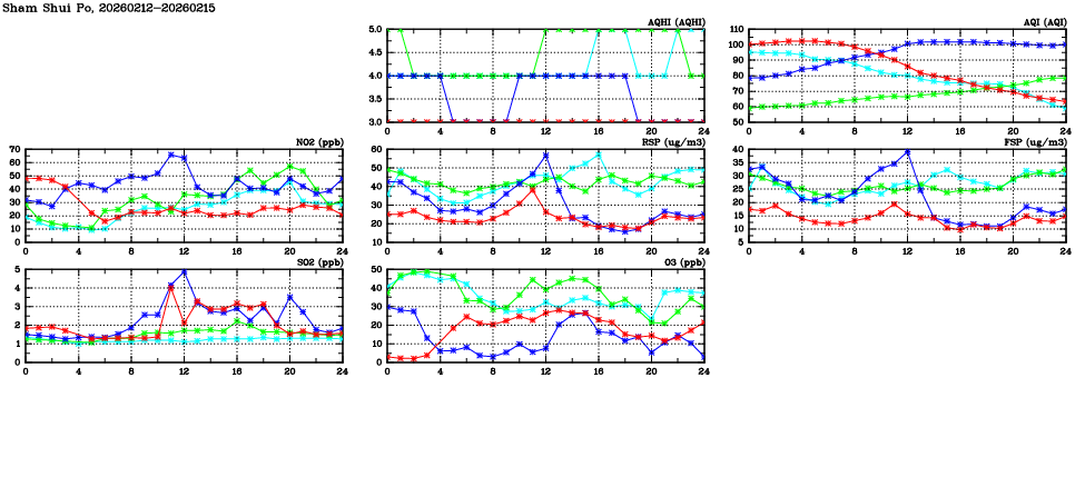 | Air Quality Data Time Series in Sham Shui Po (2026/02/15) | ( Line colors: Day -3 Day -2 Day -1 Current day ) | 2D Map Current AQHI |