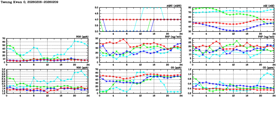 | Air Quality Data Time Series in Tseung Kwan O (2026/02/09) | ( Line colors: Day -3 Day -2 Day -1 Current day ) | 2D Map Current AQHI |