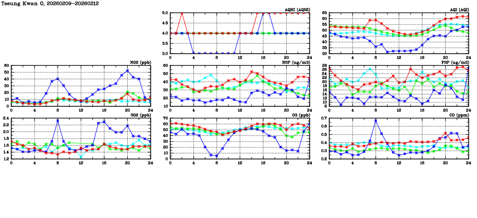 | Air Quality Data Time Series in Tseung Kwan O (2026/02/12) | ( Line colors: Day -3 Day -2 Day -1 Current day ) | 2D Map Current AQHI |