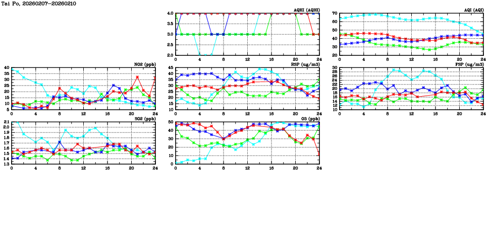 | Air Quality Data Time Series in Tai Po (2026/02/10) | ( Line colors: Day -3 Day -2 Day -1 Current day ) | 2D Map Current AQHI |
