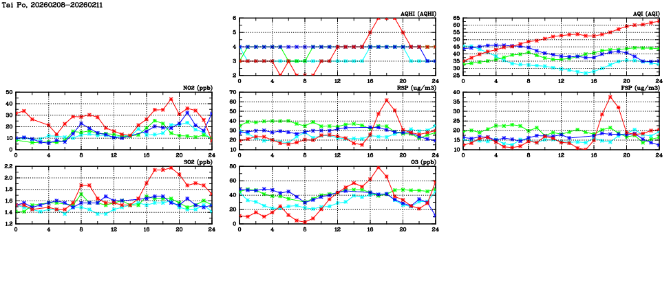 | Air Quality Data Time Series in Tai Po (2026/02/11) | ( Line colors: Day -3 Day -2 Day -1 Current day ) | 2D Map Current AQHI |