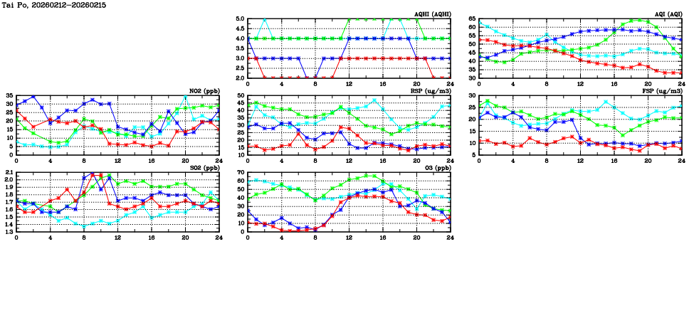 | Air Quality Data Time Series in Tai Po (2026/02/15) | ( Line colors: Day -3 Day -2 Day -1 Current day ) | 2D Map Current AQHI |